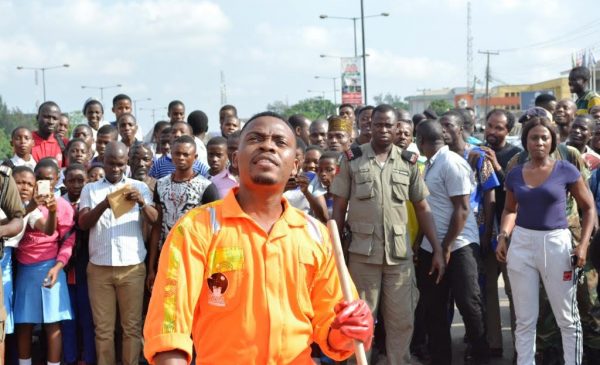 After a dreary weekend marred by flash floods, the resilient city of Lagos has gotten its groove back. Thanks to a colourful flash mob of street sweepers that toured the metropolis for three days doing choreographed dances while “cleaning” on the go.